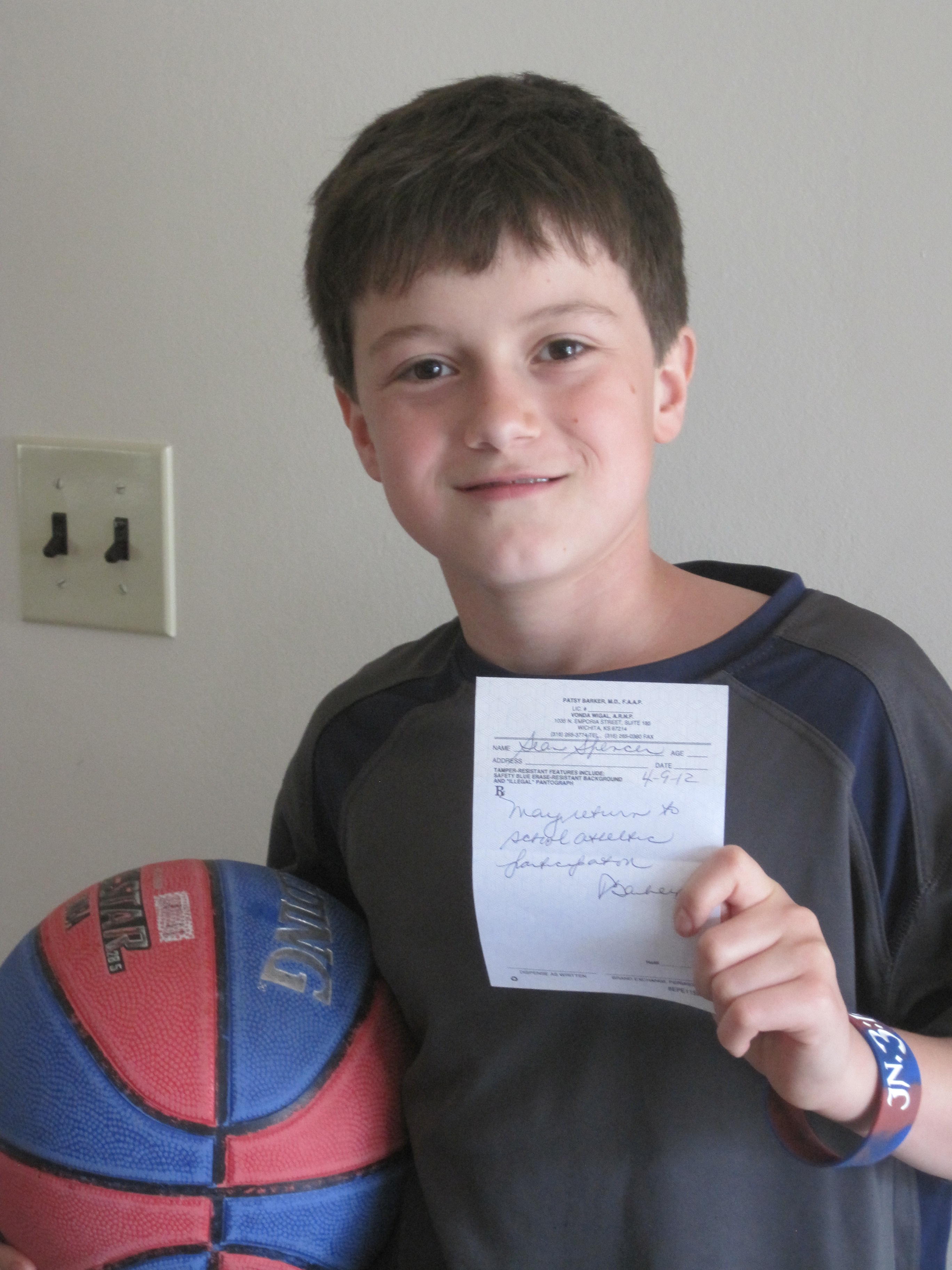 Sean with a note from the doctor clearing him for all activities following a concussion. It was a long four months.