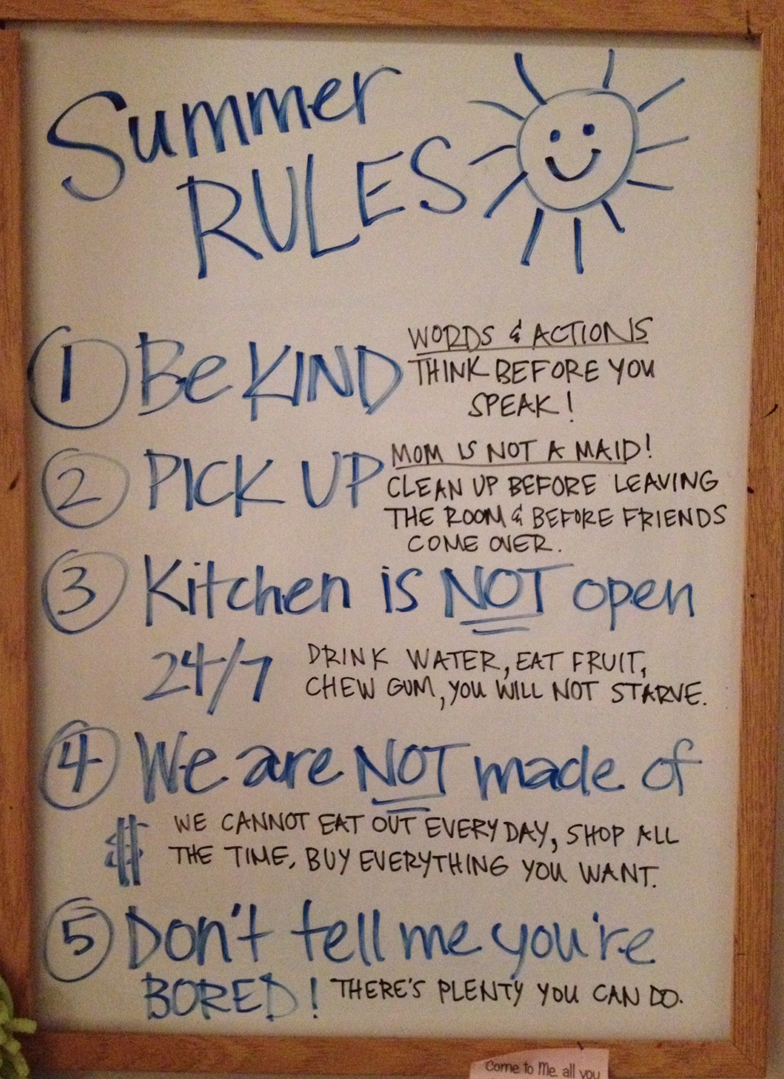 In an attempt to make peace in our house, I’ve established a few Summer Rules. Gentle reminders that (honestly) are always in place, but managed to make their way onto the kitchen whiteboard for emphasis. Look, I have good kids…but let’s face it, we’re all works in progress. I heard a radio program the other day that suggested that parents should focus more on raising GOOD PEOPLE rather than SUCCESSFUL BRATS. Sign me up! I bought the t-shirt on the proud parent thing…wore it a few times and put it in a drawer. It’s not that I don’t think my kids are the greatest (I do), but these days I’m opting for a more realistic approach to my “momness.” More like a, “Yep, those are my kiddos–good and bad.” Indeed, we are in this for the long haul.