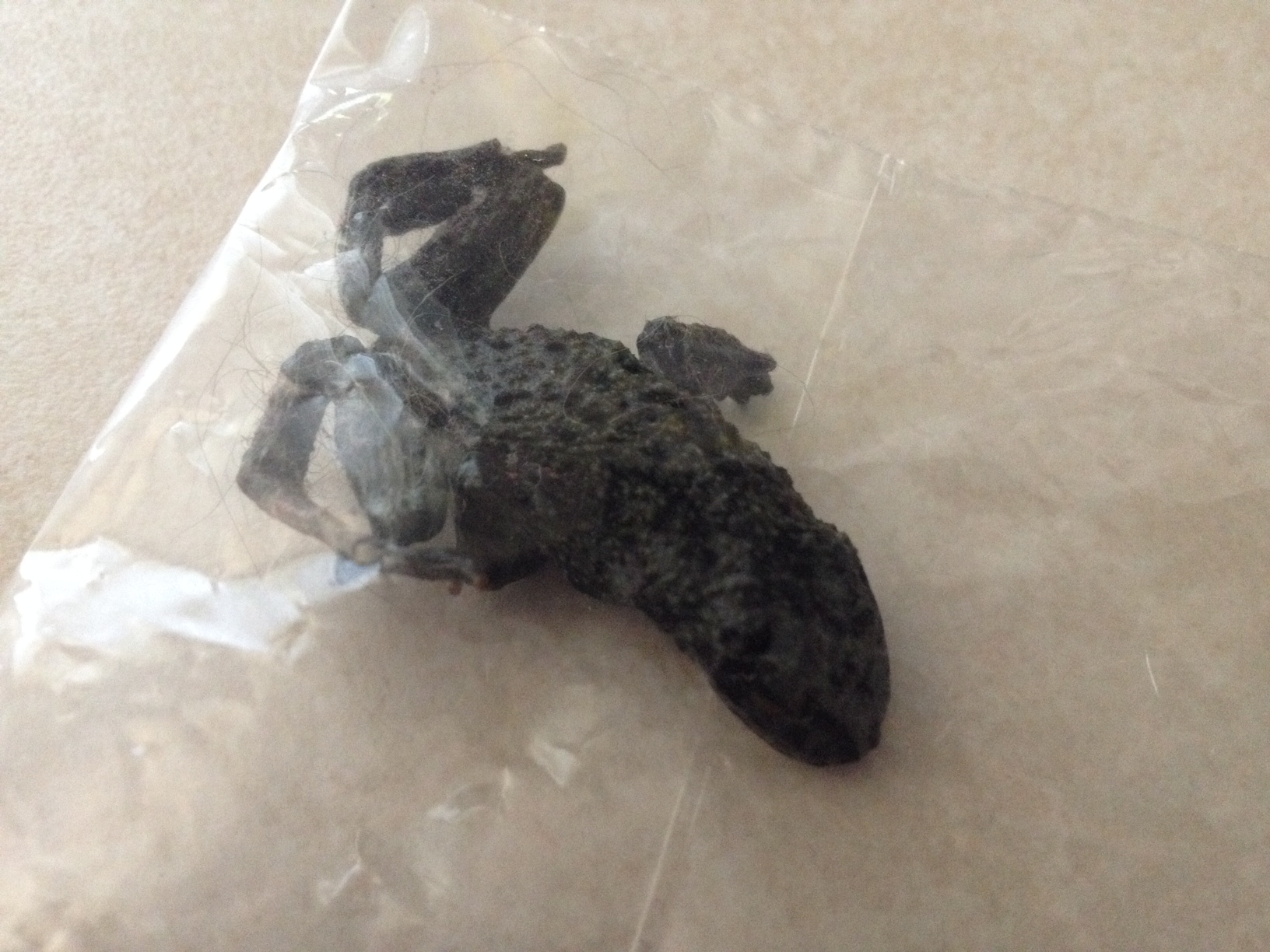 Every once in a while the toad topic would come up. Everyone had a theory. 1) Bob just couldn’t live without Trudy. 2) He escaped in a desperate effort to find her. 3) He met his doom in the belly of our dog. 4) Or….he some how managed to make it outside..found freedom and made a new life for himself. 5) Perhaps, he was eaten by the crickets (I know this one sounds extremely far-fetched, but research shows that the crickets can and will turn on a predator and in large numbers crickets can actually take a small toad down.) We just didn’t know, until…well, until we DID know.