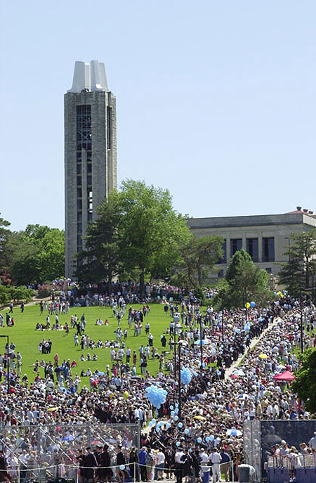 campanileEverything moved in slow motion.  The audience’s applause were my only signal that one speaker had finished and/or another speaker was being introduced.  They just kept going…probably offering up similar platitudes to the speech I gave way back in sixth grade.  “Reach for the stars, believe in yourself, this isn’t the end…it’s only the beginning,” at least that’s what I imagine they said.  Honestly, though, I have no idea.  Another motivational speech in one ear and out the other.  But what I do know for sure is that the sky was the best shade of blue that day.  The breeze was satisfying in a way that you can only appreciate when you’re wearing the color black in the heat.  Joy and relief abounded in every direction.  And while most of my classmates could hardly sit still, I remember thinking that I wanted to stay there forever.  I regret that I didn’t take more pictures back then…although I am grateful that we didn’t have the distraction of smartphones.  And just like that, it was over.  The speeches stopped and real life began again…a new chapter.  I threw my cap (paper fish and all) high into the afternoon sky and never bothered to retrieve it.  I congratulated the eight-year old girl inside of me for accomplishing her goal of graduating college and securing her “dream” job.  And just like in the movies, I had a hard time leaving that day.  There were several glances back over my shoulder.  Last looks.